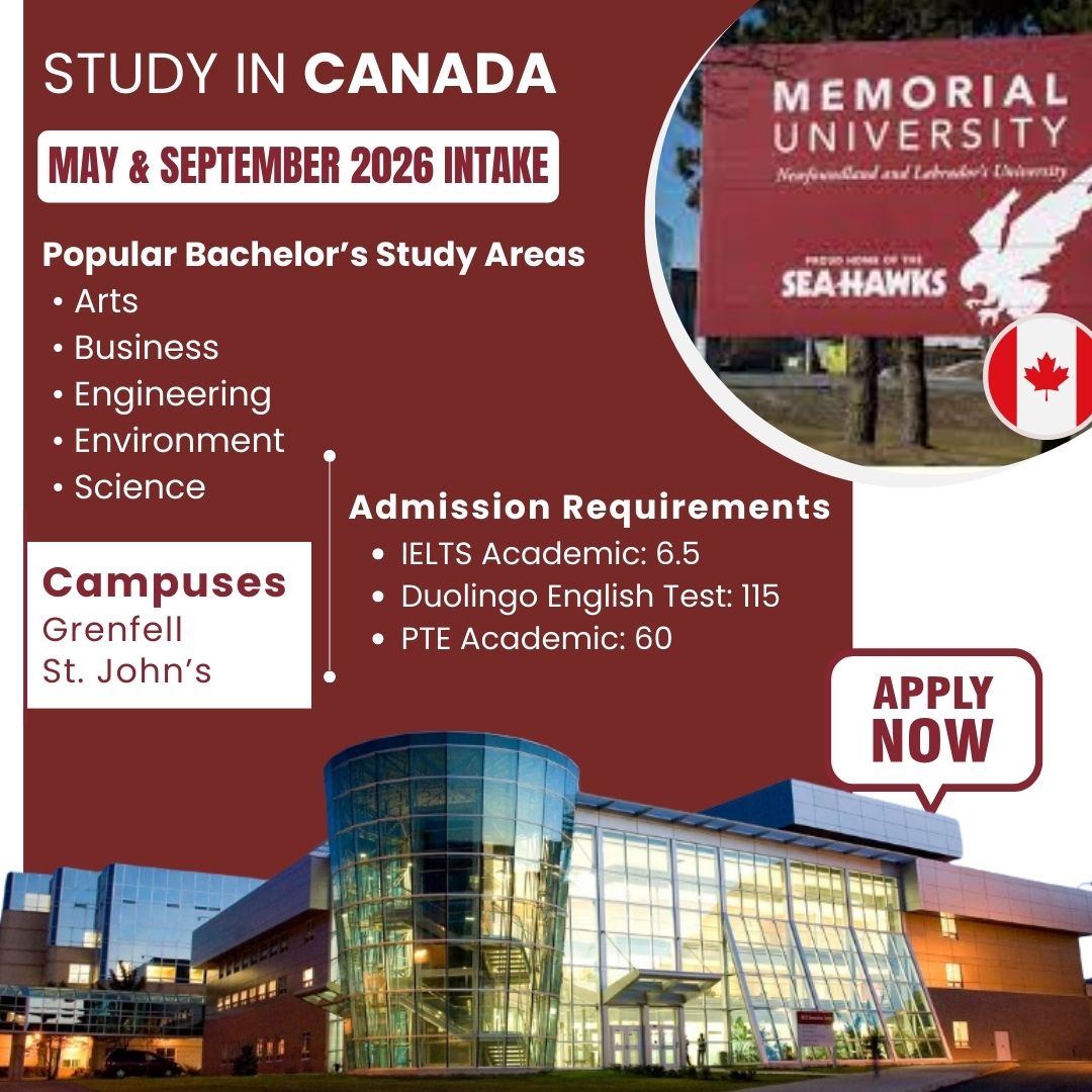 Dreaming of building your future in Canada? 2026 could be your year. Applications are now open for the May & September 2026 intake at Memorial University of Newfoundland—one of Canada’s most affordable and respected public universities.