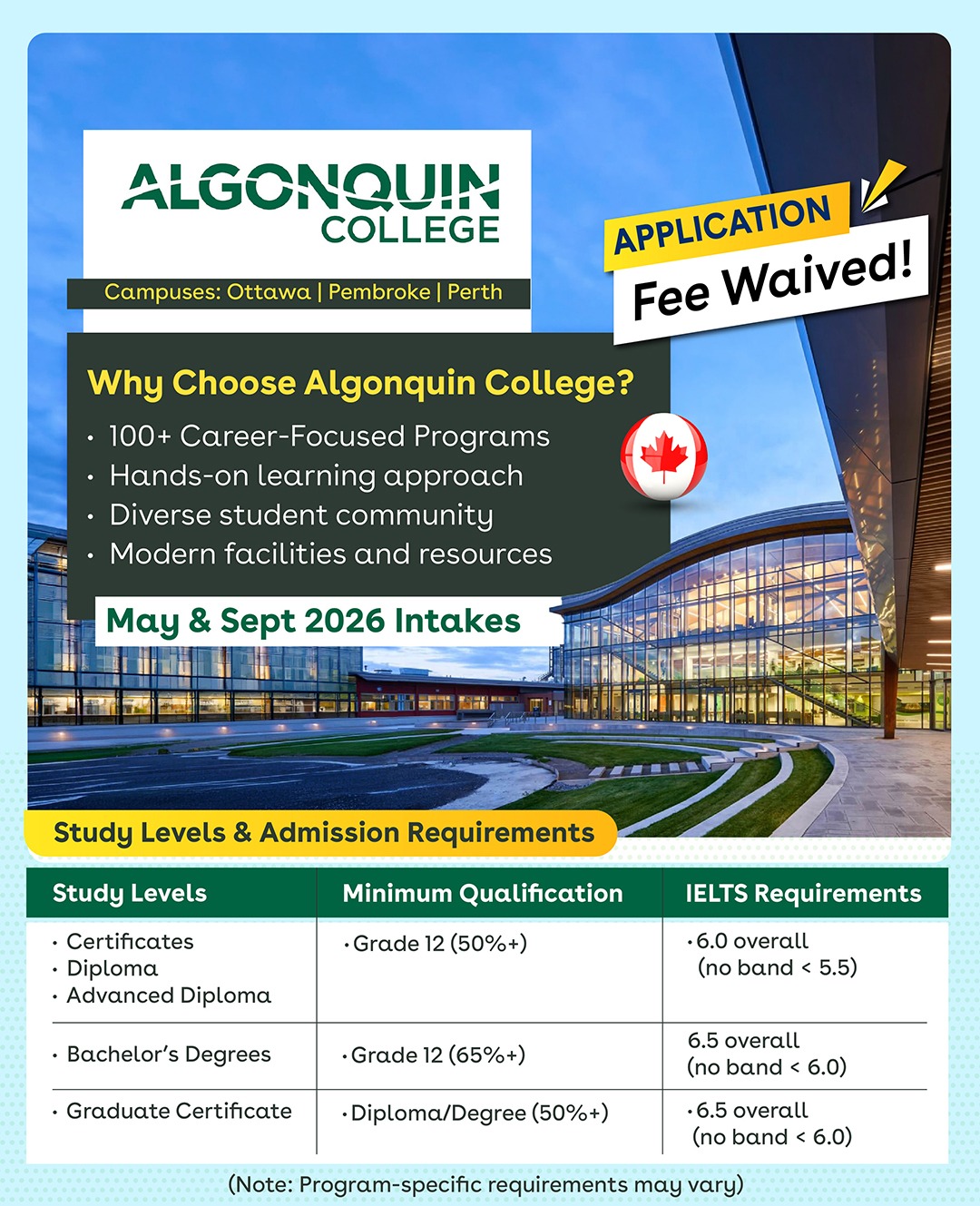 Study Abroad in Canada: Apply Now for Algonquin College May & September 2026 Intakes!